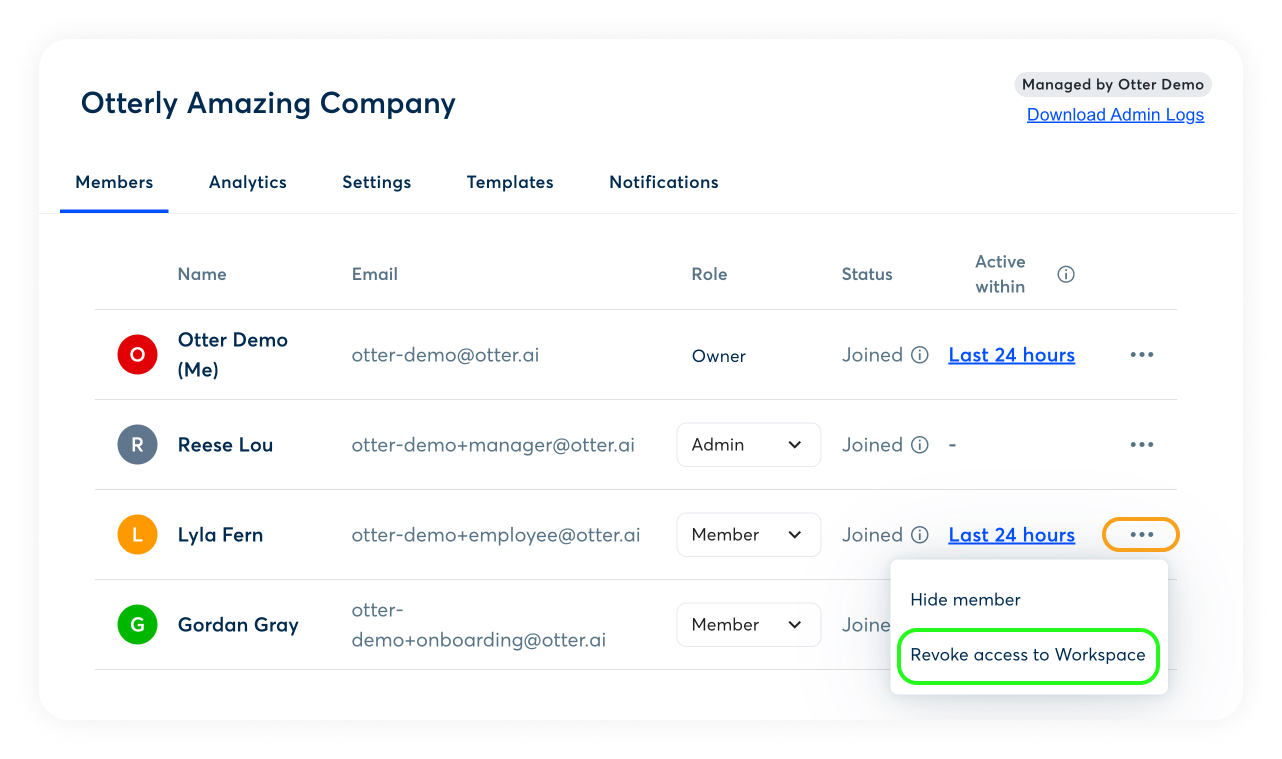 Deactivate a member to remove access while preserving their data and keeping them in your workspace. This approach is ideal for offboarding, temporary leave, role changes, or compliance reviews where conversations, transcripts, and shared content must remain available. Deactivation offers more control than removing or deleting a member, which can permanently remove data needed for collaboration, auditing, or reference.