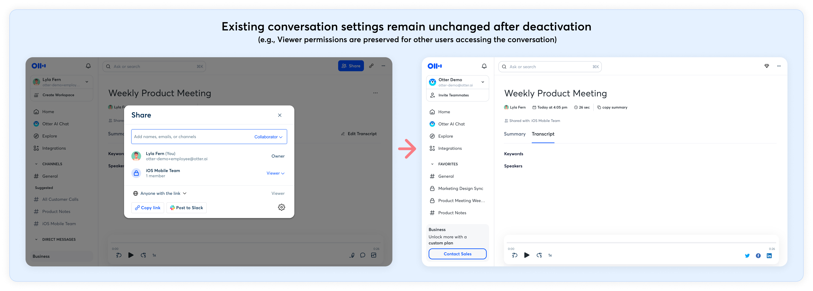 All existing sharing permissions remain unchanged after deactivation (for example, if a conversation was shared with Viewer access, it will remain accessible as Viewer). The following conversation sharing settings are preserved: