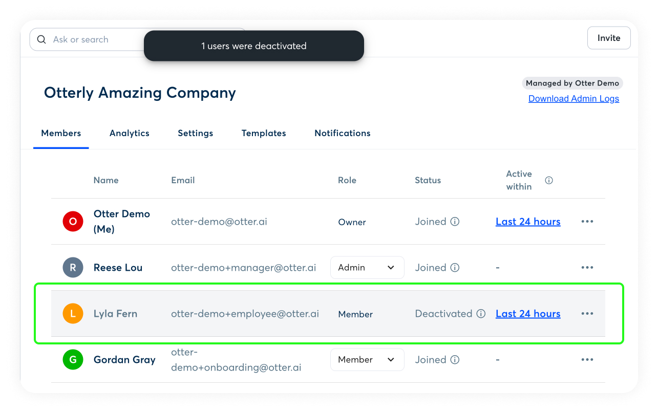 Deactivate a member to remove access while preserving their data and keeping them in your workspace. This approach is ideal for offboarding, temporary leave, role changes, or compliance reviews where conversations, transcripts, and shared content must remain available. Deactivation offers more control than removing or deleting a member, which can permanently remove data needed for collaboration, auditing, or reference.