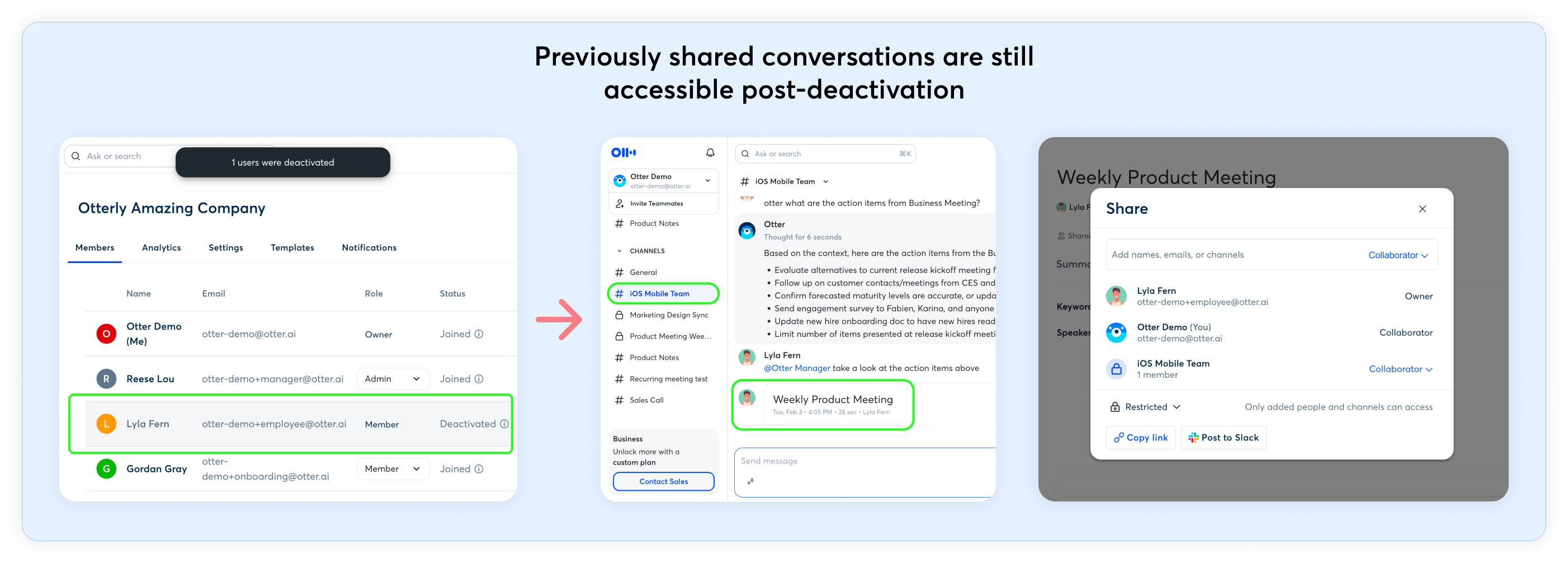 All conversations the user previously shared remain accessible after deactivation, including conversations shared to Channels or via direct share.