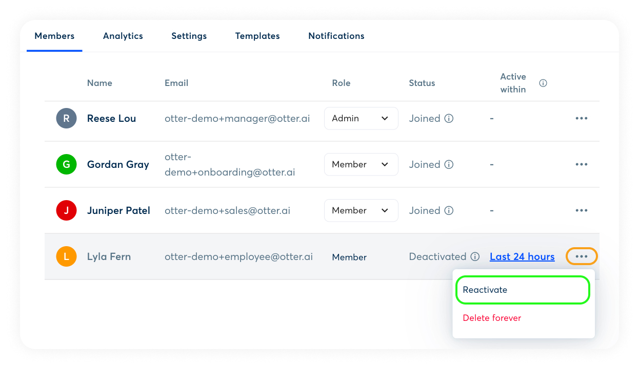 Admins can reactivate a user anytime in Workspace > Members. Click on the three-dot menu next to the deactivated user and select Reactivate.