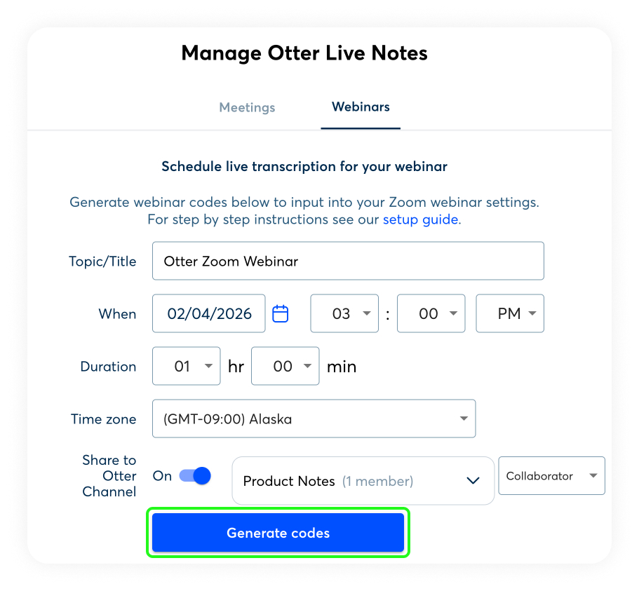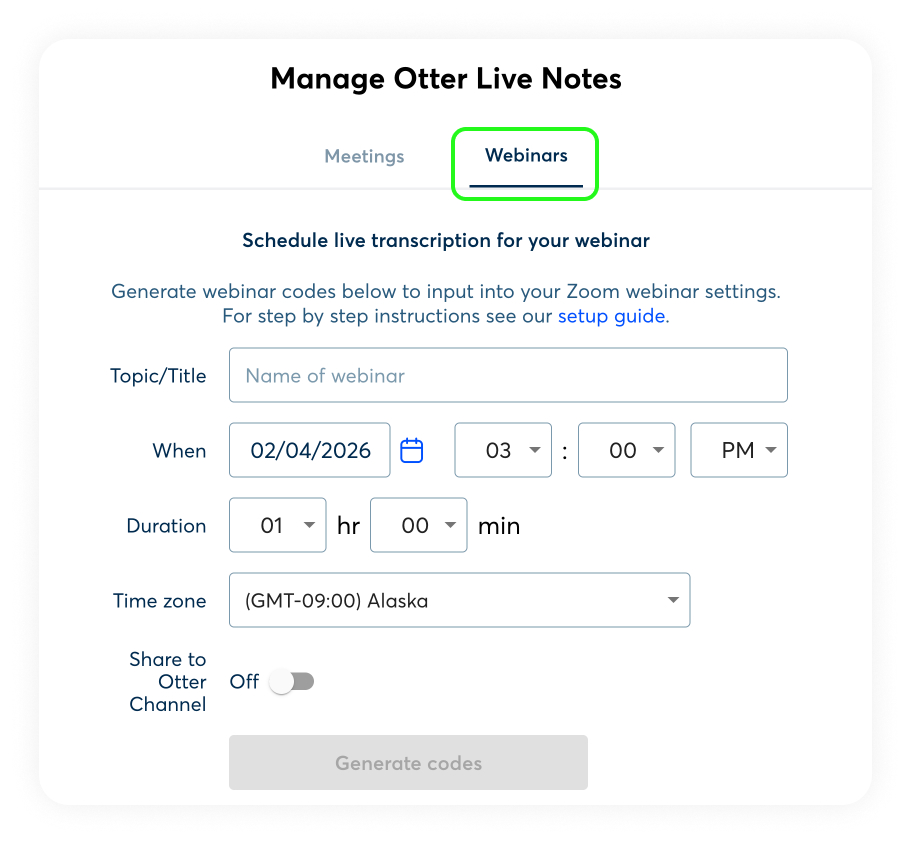 Note: Make sure the webinar time is correct. Otter can only record during the scheduled webinar time. - Copy down the webinar codes.