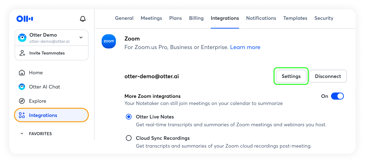 - Once Live Notes has been set up, click Settings next to Zoom on the Integration page.