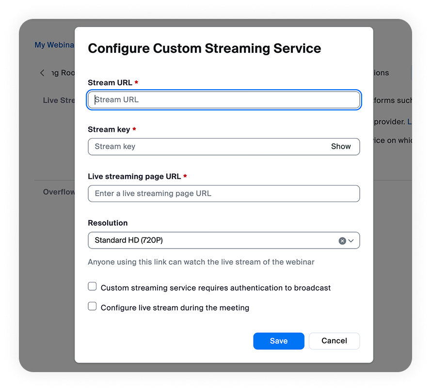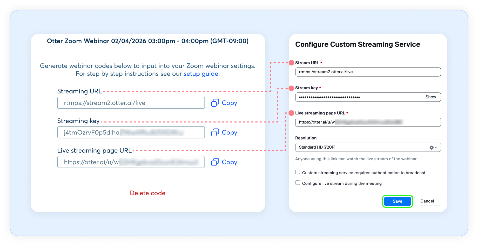 - Copy the streaming details from Otter to Zoom. Click Save when finished.