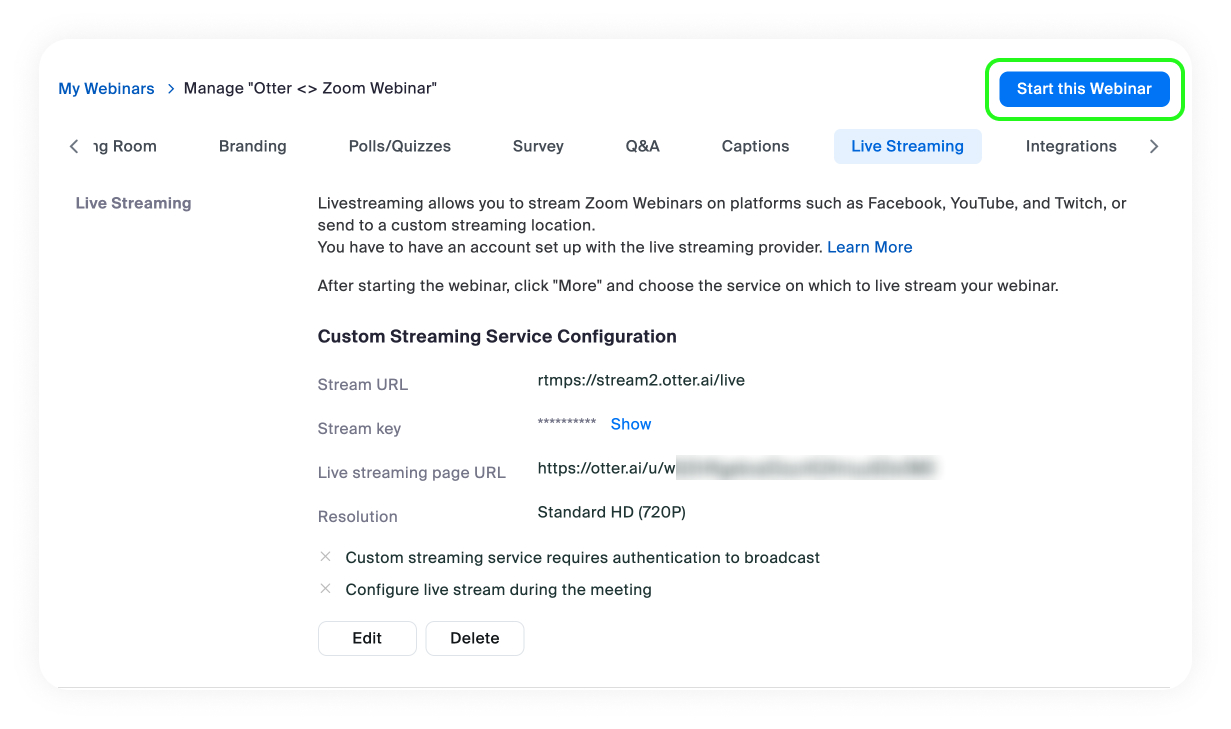 Make sure you have set up Otter Live Notes before continuing. This is required for Otter to record Zoom Webinars.