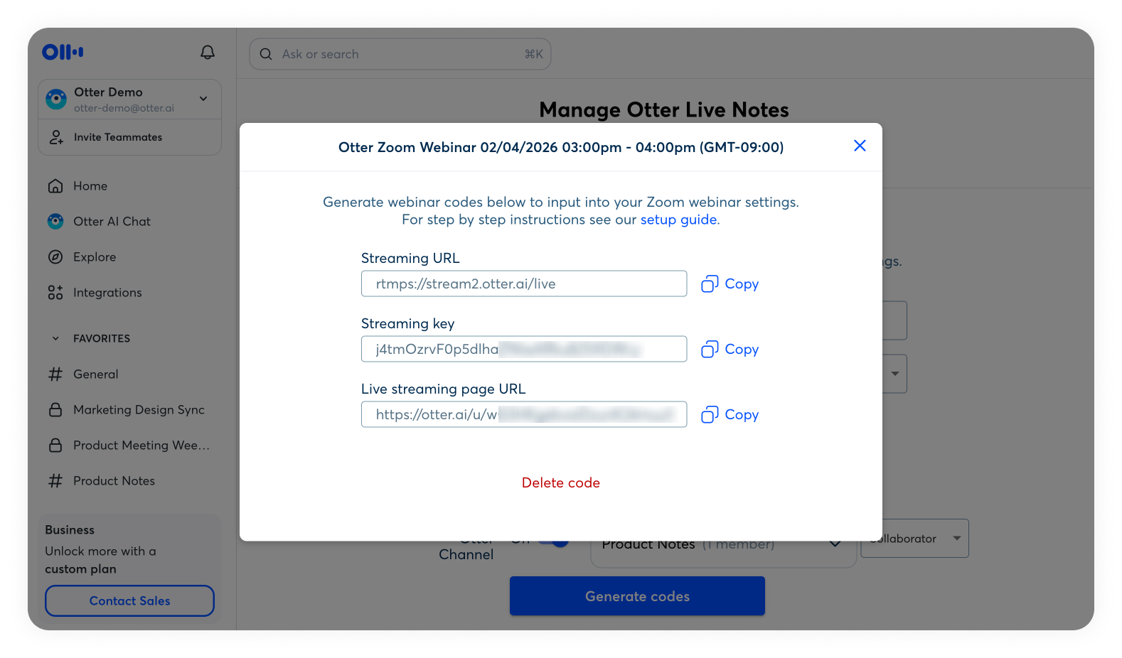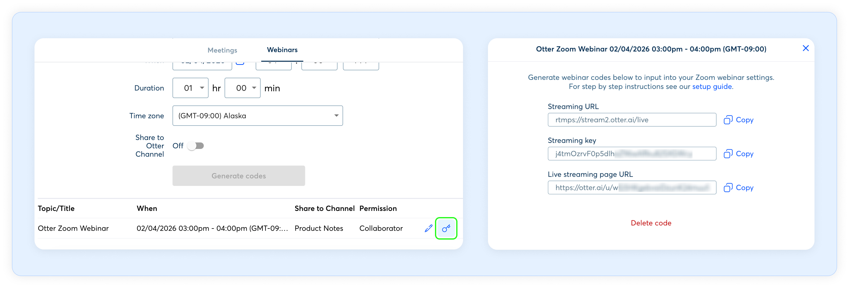 - Hover and click the key icon on the Otter webinar page to view the webinar codes again.