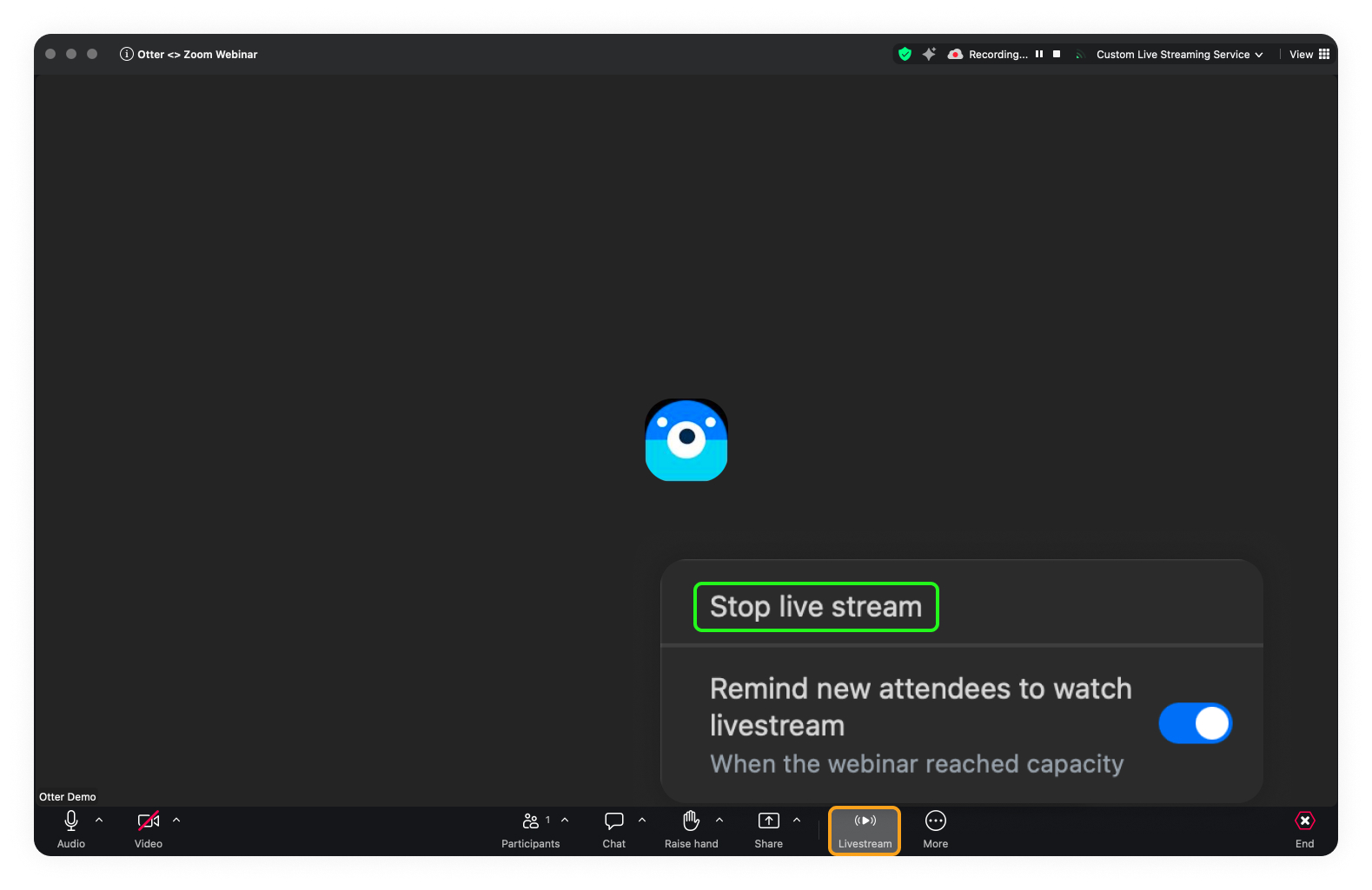 - In the Zoom webinar, click Livestream and choose Stop live stream. Otter will stop recording.
