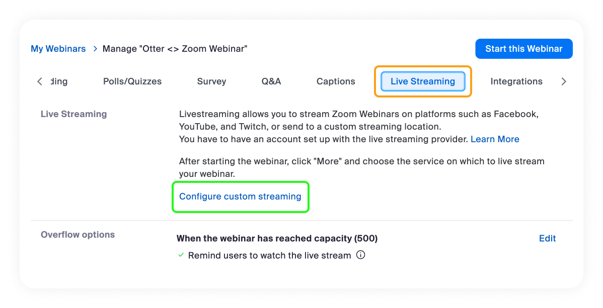 - Once the webinar has been scheduled, navigate to the Live Streaming page. Click Configure custom streaming.