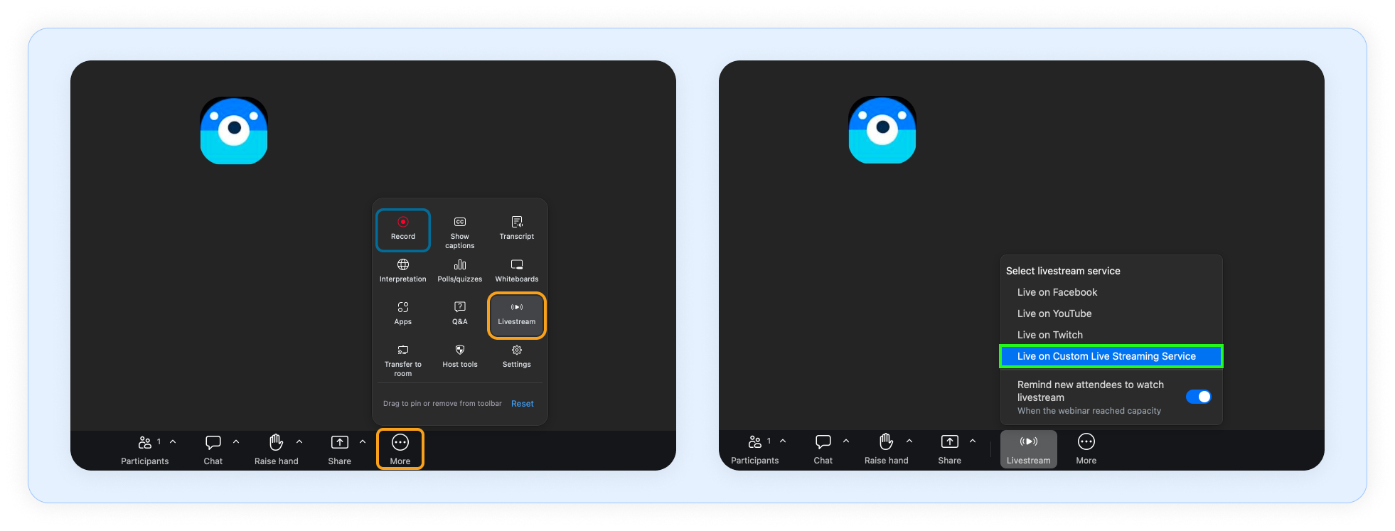 - Click More, select Livestream, then choose Live on Custom Live Streaming Service.