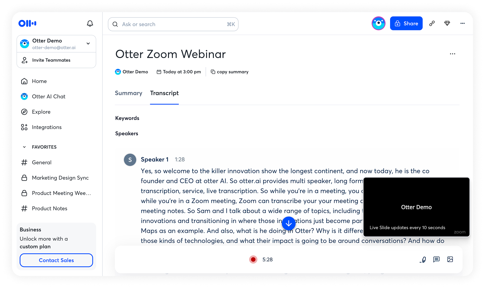 Otter for Zoom Webinars enables automatic transcription and note-taking for Zoom webinar sessions, creating a searchable transcript for collaboration and post-event reference. Stay focused on delivering your webinar while Otter captures key moments, insights, and follow-ups for you.