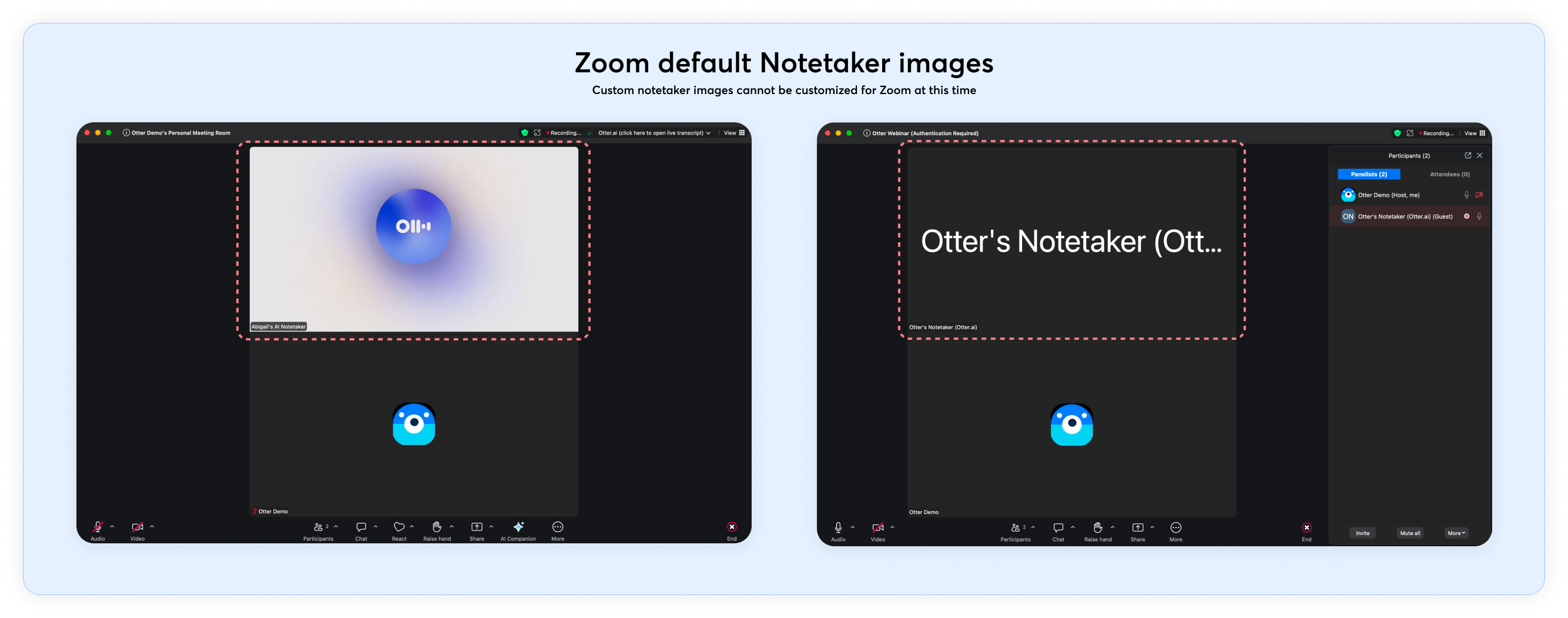 To add or update your Notetaker image, contact your Otter account manager and share the image file you’d like to use. Be sure to review the image requirements if you have any questions. Once applied, the custom image is applied for all workspace members and will appear in Google Meet and Microsoft Teams meetings.