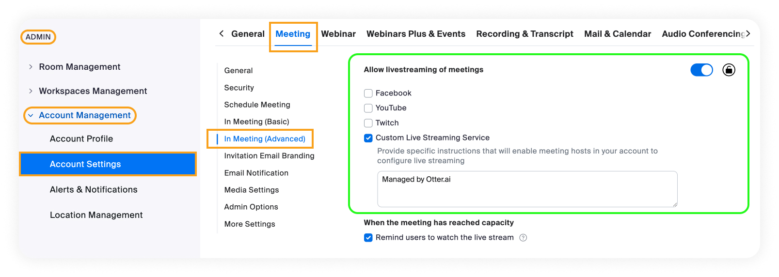 Under Admin, navigate to Account Management > Account Settings > Meeting. Click In Meeting (Advanced) and find Allow livestreaming of meetings. The following settings should be reflected.