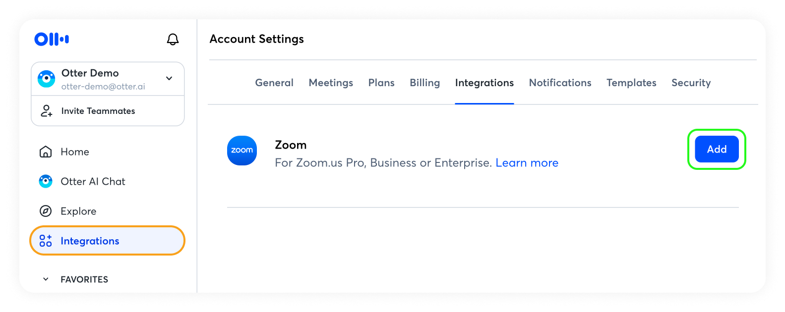 Click Integrations. Next to Zoom, click Add. Follow the steps to connect your Zoom account.