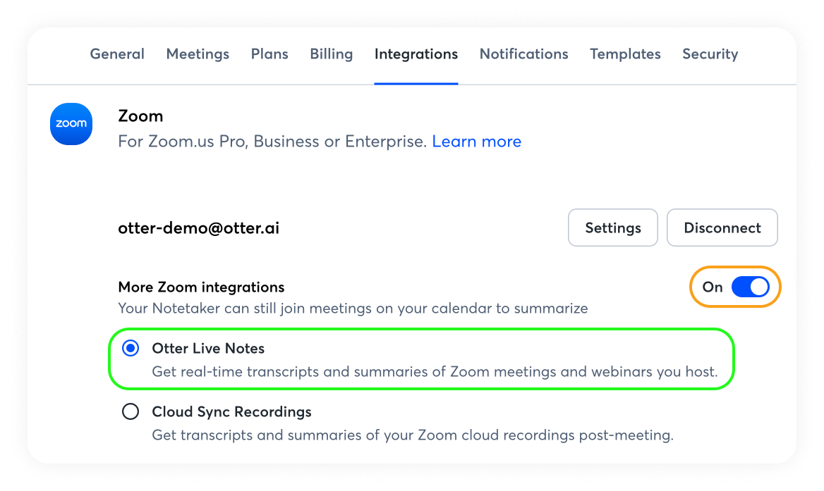 - Once connected, toggle on More Zoom integrations. Select Otter Live Notes.